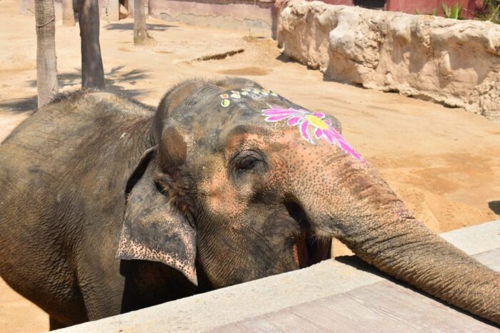 The festivities began at 11:00 a.m., when visitors were welcomed with the traditional bindi or tilak on their foreheads, a cultural symbol of protection and wisdom. A colourful parade of musicians and dancers in saris then made its way through the park to the elephant meadow, where Petita and her inseparable companion Kaiso were presented with an offering of fresh fruit and vegetables, while a gentle rendition of “Happy Birthday” was sung.